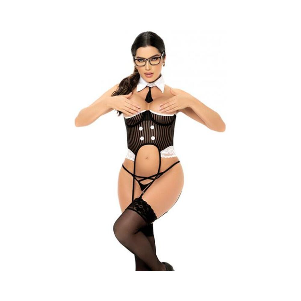 3 Pc Ceo Open Cup Bodysuit W/attached Garterstraps, Bottom & Collar W/tie Blk/wht Sm