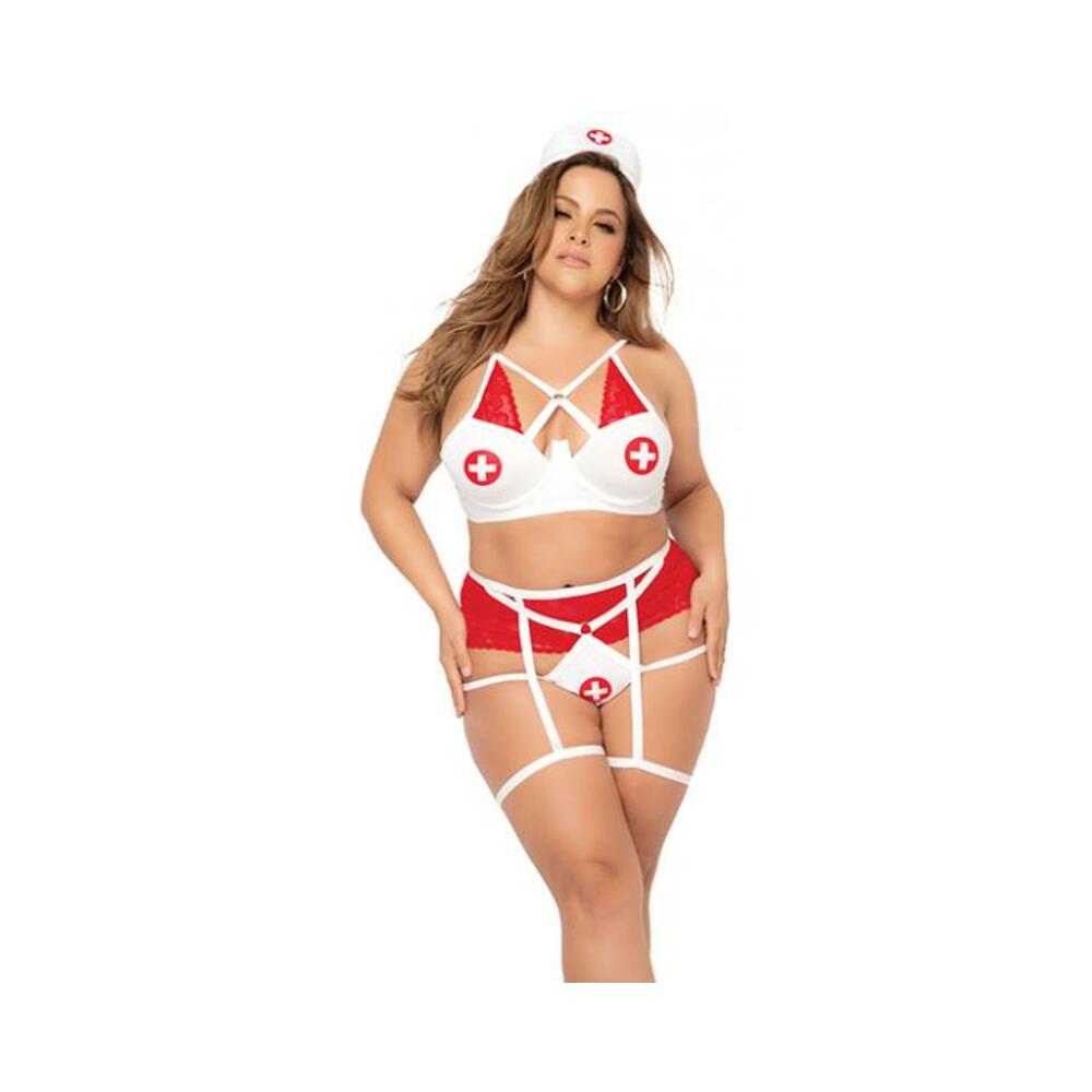 3 Pc Nurse Underwire Top, Open Back Bottom W/attached Garterbelt & Head Piece Red/wht 1x/2x