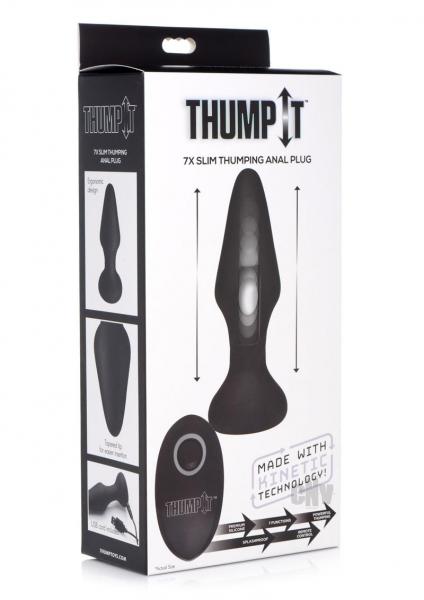 The tapered shape and slim body of this Thump It anal plug has been tried and tested to provide a fulfilling booty sensation with reduced discomfort! Featuring Thump-Its back and forth thumping Kinetic Technology to pulse and drum your backdoor with the perfect amount of force - amazing for solo play or using on a partner in combination with other naughty acts. Lube up and get your booty ready for a thumping good time! The tapered tip makes this butt plug easy to insert and comfortable to play with for most skill levels. Choose from 7 patterns of thumping functions to rhythmically pleasure your or your partners booty! The included wireless remote controller makes it easy to play solo, but really shines when you hand control over to a partner for unpredicatble thrusting fun. The premium, phthalate free silicone is velvety to the touch and firm near the tip for easy insertion, while remaining plush throughout the entire plug for a high quality feel. The delicate twist texture found on the stem is crafted to stimulate the entrance of your hole while you enjoy the thumping sensation. Body safe and luxurious, This slim butt plug is perfect for beginners and experts alike! Rechargeable with the included USB charging cable for endless thumping fun, and splashproof for ease of cleaning and shower friendly play. Compatible with water based lubricans only, avoid use with silicone lubes. Measurements: Overall length 5.4 inches, insertable length 4 inches, widest insertable diameter 1.6 inches Materials: Silicone, ABS Plastic Color: Black