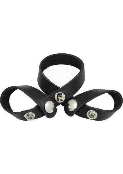 Figure 8 style leather cock ring and ball divider, in soft black, soft red, or oiltan black.
