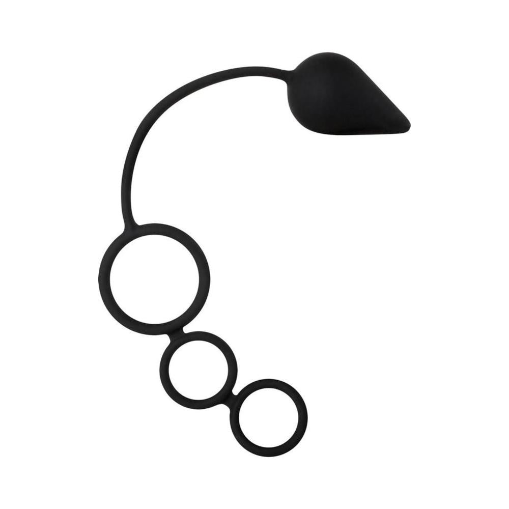 Made from silky smooth silicone, it is a tapered, ergonomic anal plug joined by three loops on a generous leash, two snug penis rings and a tantalizing ring shaped ball strap. Triple your pleasure with erection enhancing penis rings, erotic ball restriction and anal play, all at the same time! The leash doubles as a safety retrieval cord. Clean up is easy with Adam and Eve toy cleaner and hot water rinse. Features anal plug with penis rings and ring shaped ball strap. Unique combined sensations for intense pleasure. Penis rings, ball strap and anal plug connected by leash. Made from body safe silicone. Anal plug is 2.42 inches long, 1.52 inches wide. Entire leash is 14.5 inches long. Ball strap is 1.8 inches wide. Each cock ring is 1.25 inches wide. Use with water based lube. Waterproof, non-vibrating anal plug. @npc2019_34