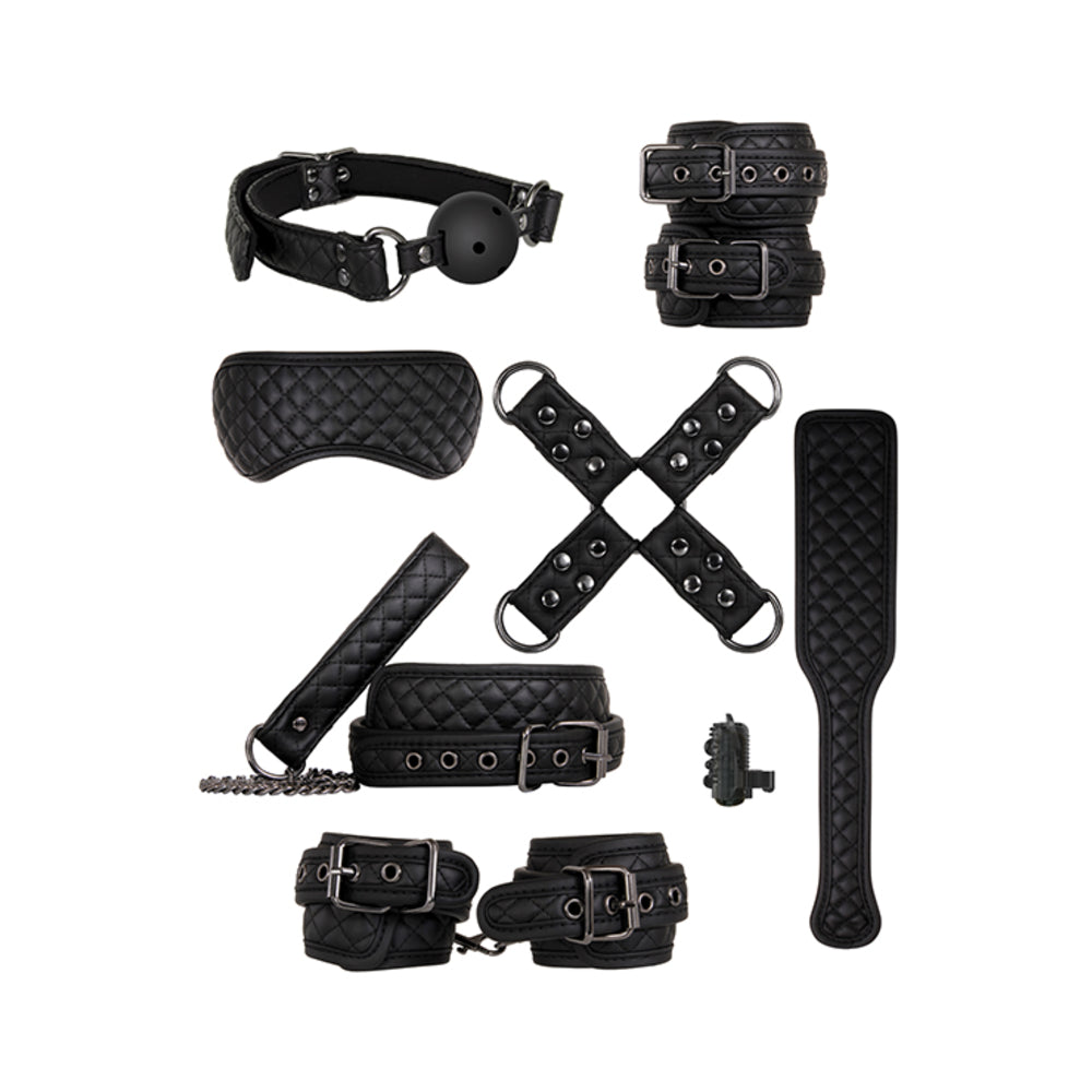 Get everything you need to bring your kinky fantasies to life! Made from padded diamond-stitched vegan leather, this gorgeous 7-piece bondage kit gives you so many ways to play. Cuff ankles and wrists together or to the four-way cross buckle to achieve the wildest bondage positions. A breathable ball gag and soft blindfold keep the wearer quiet and heighten anticipation. Take control with the leash or submit to wearing the comfortable padded collar. Dole out caressing rewards or punishments with the spanking paddle. Buckle closures and snap hooks are secure enough to let any submissive writhe and strain against them, but release fast for a quick escape. It's the easiest, most stylish way to explore the limits of your BDSM dreams Sets of padded ankle & wrist cuffs with swivel snap connectors Four-way riveted cross buckle lets you connect all four cuffs Breathable ABS plastic ball gag lets you moan and groan, but not speak Padded vegan leather collar with removable lightweight chain leash Flexible yet firm spanking paddle delivers kinky thrills Blindfold heightens sensory awareness and anticipation Combine for fetish thrills! Get a blindfolded spanking, hook wrist cuffs to collar, do your best to beg wearing the ball gag, and more. In sophisticated & comfortable padded diamond-stitched vegan leather Secure buckle closures, rivets, and chain in sturdy dark metal Wrist cuffs fit up to 2.4" wide wrists Ankle cuffs fit up to 3.45" wide ankles Adjustable collar fits up to 18.5" neck Paddle: 13" long x 2.43" wide Leash: 36" long, 29.5" chain, 6.5" hand loop