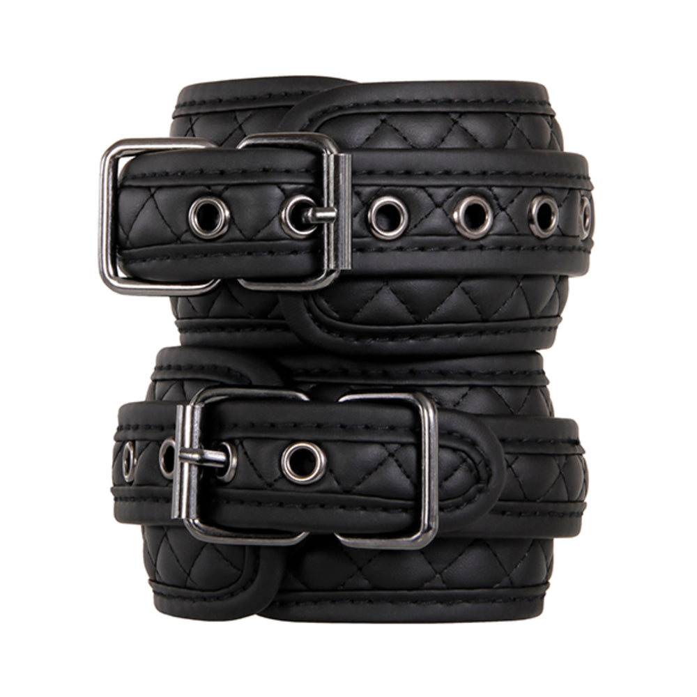 Adjustable vegan leather ankle cuffs Soft diamond-stitch padded restraints Perfect for bondage fantasies/role-playing Hook cuffs together or separate them Cuffs connect with swivel snap hooks Durable metal buckles & rivets 11.25” long, 2.3” wide Fits up to 3.45” wide ankles