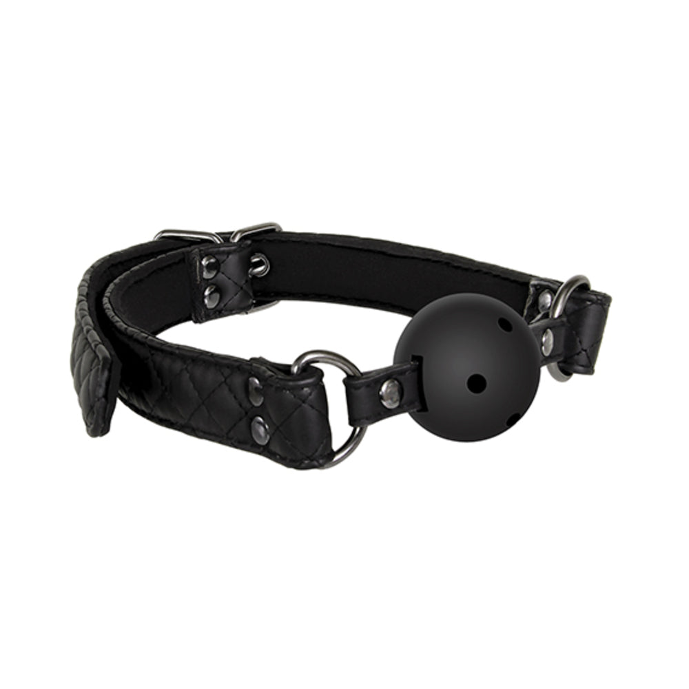 Push your bondage boundaries with this wicked breathable ball gag. The smooth, firm gag fits into your mouth, keeping you from speaking while you play the kinkiest games. Multiple holes in the gag make it easy to breathe, moan, and groan and surrender to any fantasy. Adjustable diamond-pattern vegan leather straps keep the gag securely in place and keep you comfortable no matter how hard you play. Kinky breathable ball gag Smooth ball gag holes let you breathe easy Soft padded vegan leather straps Buckles in back for a secure fit Adjustable, one size fits most Dark finish metal buckles & rivets In ABS plastic, metal, and vegan leather Straps: 12” long, 1.05” wide Ball: 1.72” diameter