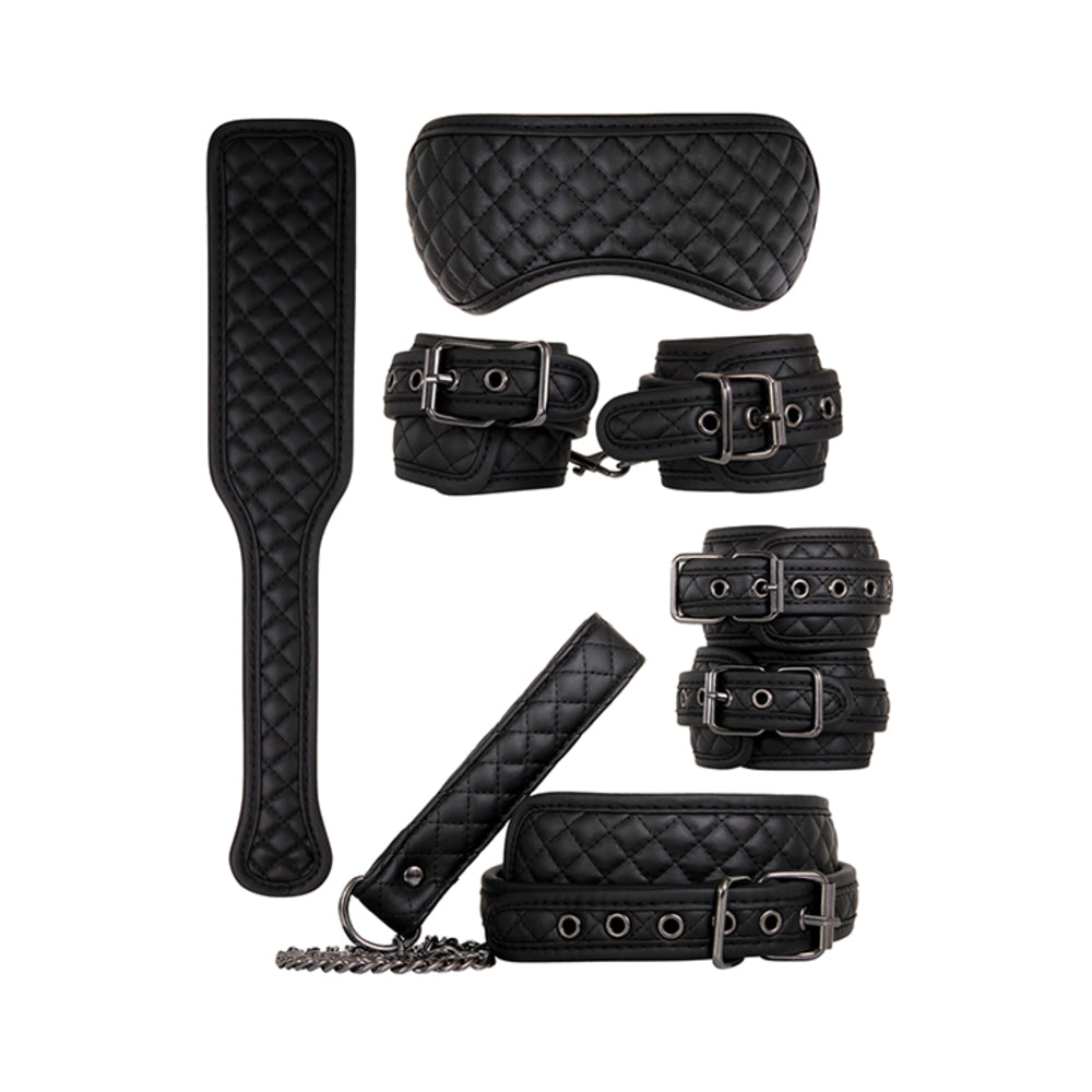 Take command of your domination fantasies with a kit that has everything you need for your wild side! Collar your lover in padded vegan leather and clip on the leash to lead them around as you desire. Use the ankle & wrist cuffs for erotic restraint in dozens of sexy positions that stay put – metal hardware lets them writhe to their heart’s content! Heighten their senses with a comfy blindfold – tell them what’s coming – a nice, hot spanking with a sturdy paddle! They’ve been so naughty and deserve all this wicked attention. Now you’re in control of their pleasure – every step of the way! Set includes ankle cuffs, wrist cuffs, paddle, blindfold, collar & leash Perfect for erotic restraint play, sensory deprivation, spanking & other kinky fantasies Use your imagination for countless scenarios & positions Cuffs, collar, blindfold & paddle made from soft diamond-stitched padded vegan leather Buckles, rivets & hooks made from durable metal Wrist cuffs fit up to 2.4” wide wrists Ankle cuffs fit up to 3.45” wide ankles Leash: 36” long, 29.5” chain, 6.5” hand loop Collar fits up to 18.5” neck Paddle: 13” long x 2.43” wide Blindfold stays secure with comfortable elastic strap