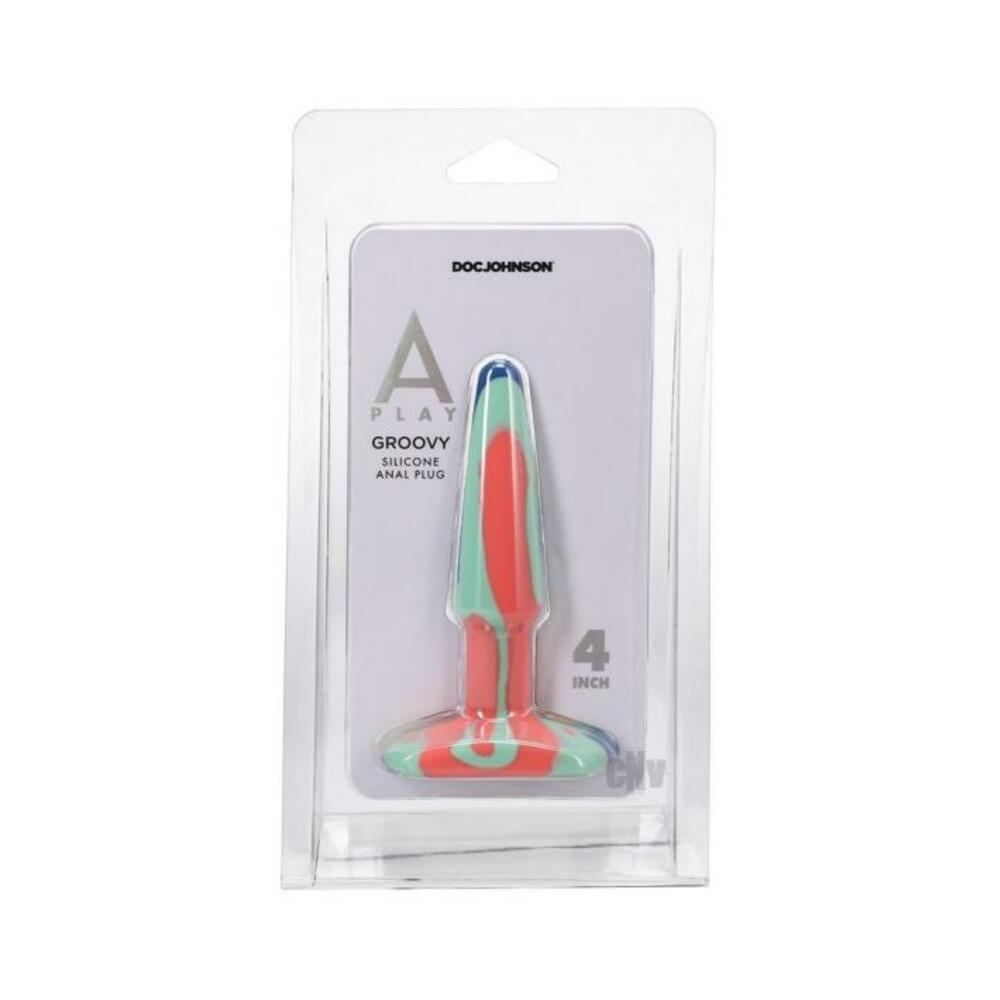The A-Play Groovy is a soft multi-colored anal plug made of health-grade silicone. Its tapered tip and wide base make for safe, comfortable play, and its firm-yet-flexible feel allows for a little wiggle. Each plug is unique and has its own variation of the color pattern.Features Made from Health-Grade Hygienic Silicone Tapered Tip for Easy Insertion Wide Base for Safe Play Warms to Body Temperature Firm Yet Flexible Easy to Clean; Top Rack Dishwasher-Safe Hypoallergenic, Nonporous, and Odorless Phthalate-Free, Body-Safe Dimensions Total Length: 4.25 in. (10.8 cm) Insertable Length: 3.75 in. (9.5 cm) Width/Diameter: 0.75 in. (1.9 cm) Circumference: 3 in. (7.6 cm)