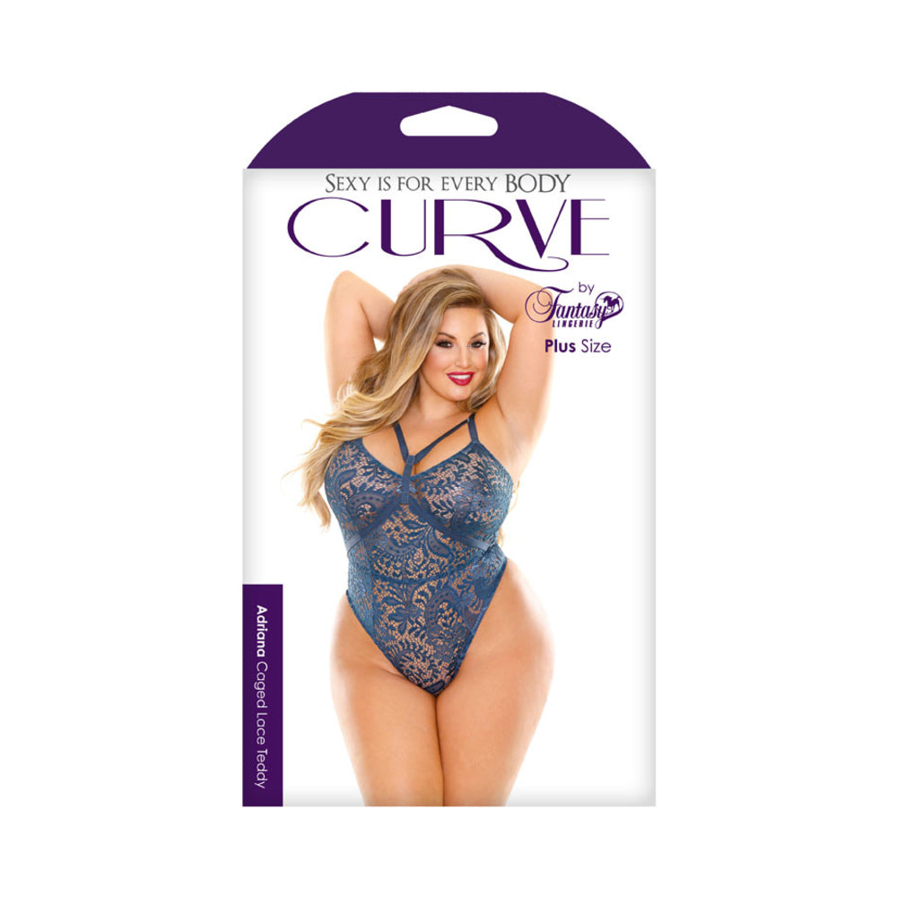 Brand: Curve Features: Plush Lace - Cage Over Bust Look - High Leg Cut - Adjustable Straps Materials:90% Nylon 10% Spandex Color: Blue Washing Instructions: Hand wash separately in cold water. Do not bleach. Flat dry. Product Description: Featured in a gorgeous blue color, the sultry Adriana teddy is constructed with a trendy caged look over the bust. Cut is high on the leg to accentuate the figure. Straps are adjustable. Sizing Info: 1X/2X Size: 14-18 Bust: 40"-46" Hips: 44"-49