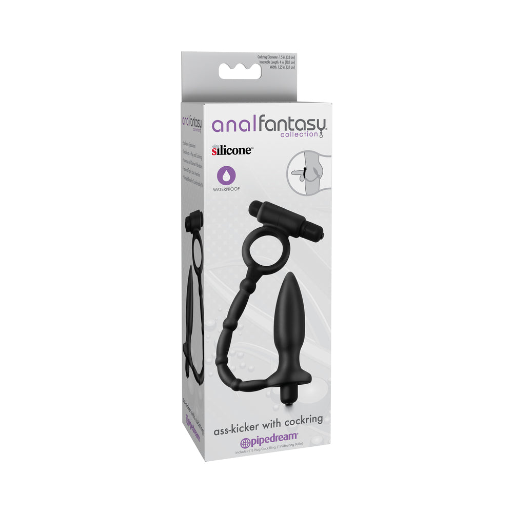 Enjoy the most explosive ejaculation ever with the Ass- Kicker with Cockring. Made entirely from our silky-smooth Elite Silicone™, this wearable plug doubles as a performance-enhancing cockring, allowing the wearer to prolong ejaculation and extend the fun while enjoying incredible anal stimulation. With the Ass-Kicker with Cockring in your ass and the ring wrapped snug around your cock, you'll stay harder and stronger than ever before! The super-stretchy silicone ring puts the squeeze on performance letdowns, maintaining firm erections that last and last! The tapered tip of the plug ensures easy entry, while the thin neck and flanged base keeps it comfortably in place even when the action heats up. Just a click of the button on both bullets will send thrilling vibrations around your cock and up your ass, making you cum harder than ever before! Our ultra-hygienic Elite Silicone™ is phthalate-free, hypoallergenic, and can be worn all day for long-lasting fun. Cleanup is a snap after the fun with the included Refresh Anti-Bacterial Toy Cleaner and warm water. Every Anal Fantasy box features a FREE 5-Piece Prep Kit to help you ease into comfort and clean up afterwards. The kit includes 2 finger sleeves, anal desensitizing cream, anal lube, and toy cleaner. Cockring Diameter: 1.5 in. (3.8 cm) Plug Insertable Length: 4 in. (10.1 cm) Plug Width: 1.25 in. (3.1 cm)