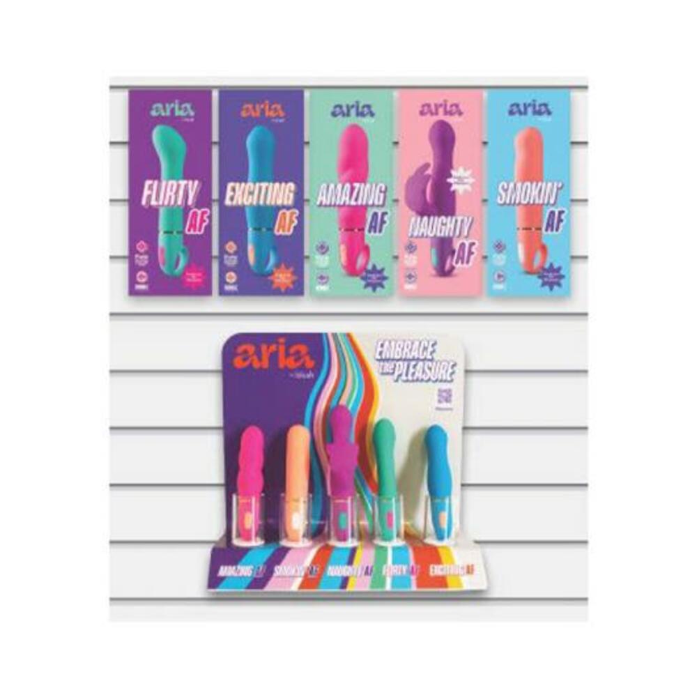 M-00099 Aria Merchandising Kit includes: (3 pcs) BL-21922 Aria - Flirty AF - Teal (3 pcs) BL-21902 Aria - Exciting AF - Blue (3 pcs) BL-21900 Aria - Amazing AF - Fuchsia (3 pcs) BL-21801 Aria - Naughty AF - Plum (3 pcs) BL-21700 Aria - Smokin' AF - Coral Marketing Asset includes: (1 pc) 99952-dk Aria - Vibe Tester Display Kit (1 pc) TESTER BL-21922 Aria - Flirty AF - Teal (1 pc) TESTER BL-21902 Aria - Exciting AF - Blue (1 pc) TESTER BL-21900 Aria - Amazing AF - Fuchsia (1 pc) TESTER BL-21801 Aria - Naughty AF - Plum (1 pc) TESTER BL-21700 Aria - Smokin' AF - Coral