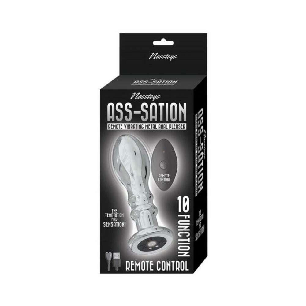 Ass-Sation brings together metal and vibration for orgasmic results. For lovers of metal sex toys, you can now take part in a vibration in your favorite material sensation. Explore 10 different vibrating functions using the controls on the toy or the handy remote control. Try immersing the Ass-Sation Remote Control Vibrating Metal Butt Plug in warm or cool water beforehand for fun sensation play. The Pleaser Plug comes in a sleek design that features a rounded tip and prostate-pleasing bulb. The bulb is ergonomically shaped to hit the nerve-ending packed prostate perfectly once fully inserted. The Pleaser Plug is sized for intermediate level manageability - precision tapering, gradual widening and a nice slim neck combine to make it easy to insert, simple to maneuver, and comfortable for longer term wear, thanks to a nice flat base and remote control. Use with any of your favorite lubricants. After use, carefully wash the toy with mild soap and water or Toy Cleaner for even quicker cleanup. 10 function Remote control Power button lights up Magnetic charge Waterproof Phthalates free RoHS compliant Materials: Silicone & aluminum, Remote: ABS Plug Size: Length: 4.5", Width: 1.25", Circumference: 4" Remote Size: 3" x 1.75" Rechargeable: Charging Time: 2.5hrs. Usage Time: 2 hrs Voltage: 3.7V