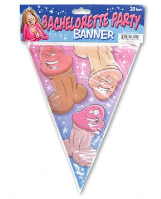 Bachelorette Party Banner features fun cartoon penises on triangle shaped flags plus two string to tie up to decorate your room to celebrate her last night as a single woman. Bachelorette Party Banner from Ozze Creations.