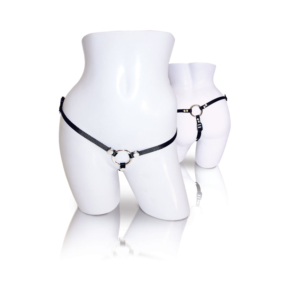 The Bare As You Dare Harness is a thong-style harness with 1.5" metal o-ring. The 3 way adjustable straps fit up to 60" hips but it's small enough to fit in your purse or under your clothes.