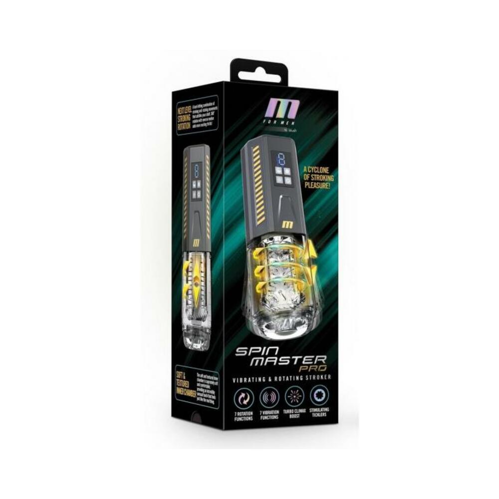 Experience a cyclone of pleasure with the SpinMaster Pro! This automatic male masturbator is built for serious performance and innovation, transcending your play to an elite standard of luxury. Customize your stroking sessions with 7 bold vibration modes and 7 stroking rotation modes with a blend of varying speeds and patterns. 360° full rotation stimulates every inch of your shaft, wrapping you in a vortex of phenomenal mind-blowing sensations. Activate the SpinMaster's turbo climax boost for maximum speed and power, testing your edge and building to an amazing climax. The digital display function tracks your settings on the stroker's front screen, so you can seamlessly operate between modes. The soft and textured inner chamber provides a smooth, realistic feel with a protective case that keeps it clean for long term use. With a USB-C charger included, enjoy up to 60 minutes of power on a full charge, going longer and harder than ever before. Are you ready to handle the storm?