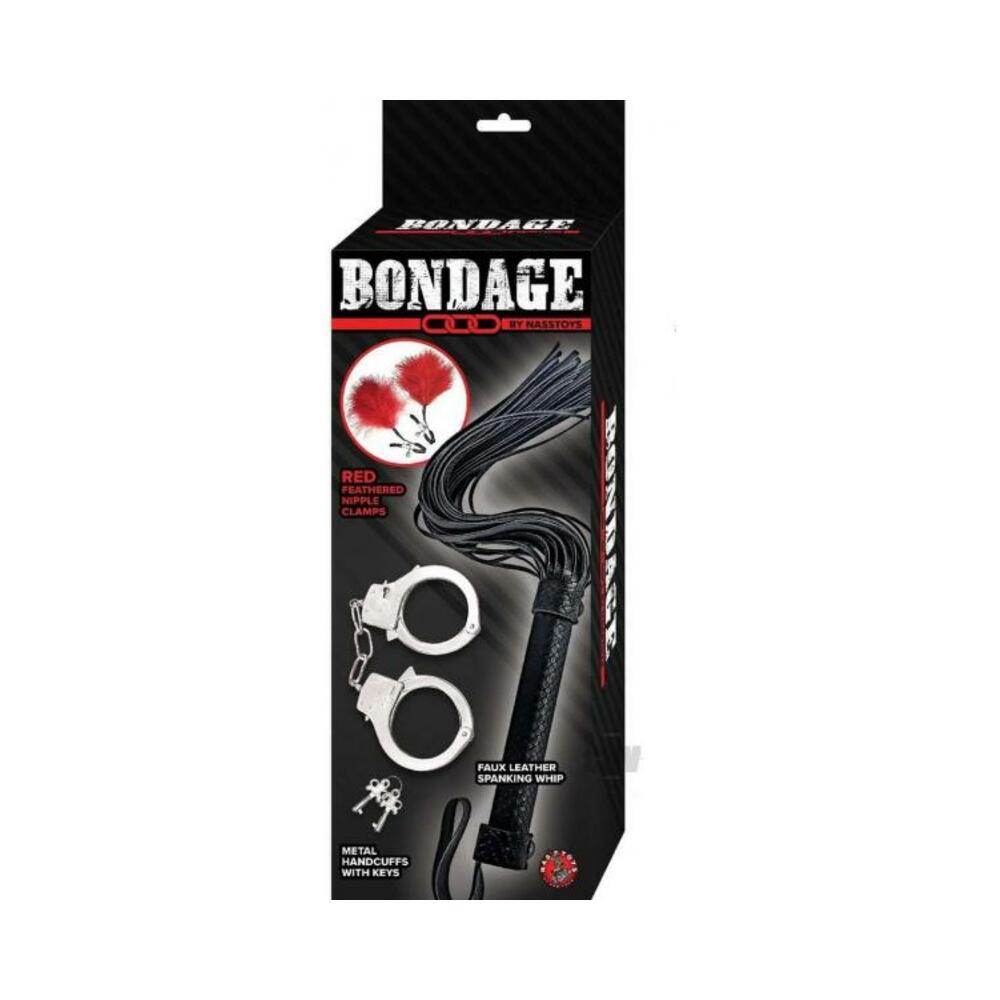 Introducing the Nasstoys Bondage Kit–the perfect blend of playful exploration and thrilling sensations, designed especially for beginners. Unleash your desires and dive into the world of bondage with confidence, courtesy of this thoughtfully curated kit. Whether you're a newcomer to the world of bondage or a seasoned explorer, the Nasstoys Bondage Kit is an excellent choice for those seeking a gentle introduction. Discover the excitement of restraint and sensory play with this carefully crafted set.Experience the thrill of being bound with the included quick-release metal handcuffs. These cuffs provide a secure yet easily removable restraint, ensuring safety and comfort throughout your playtime.Elevate your sensory experience with tantalizing nipple clamps adorned with soft red feathers. Perfect for adding an extra layer of sensation, these clamps allow you to explore the delightful balance between pleasure and a gentle, teasing touch.Unleash your inner desires with the faux leather flogger, designed to deliver a satisfying combination of pleasure and playfulness. The gentle swish of the flogger against the skin adds an exciting element to your intimate moments.The Nasstoys Bondage Kit is compact and discreet, making it an ideal companion for travel or spontaneous adventures. Bring a touch of excitement to any setting with this easily storable and transportable set. Feathered nipple clamps Faux leather spanking whip Metal handcuff with cuffs Phthalates free Materials: Silicone, ABS Whip Size: Length: 1", Width: 1", Height: 15" Nipple Clamp Sizes: Length: 1", Width: 2", Height: 6" Handcuff Sizes: Length: 3.125", Width: 3.125", Height: 10.625"