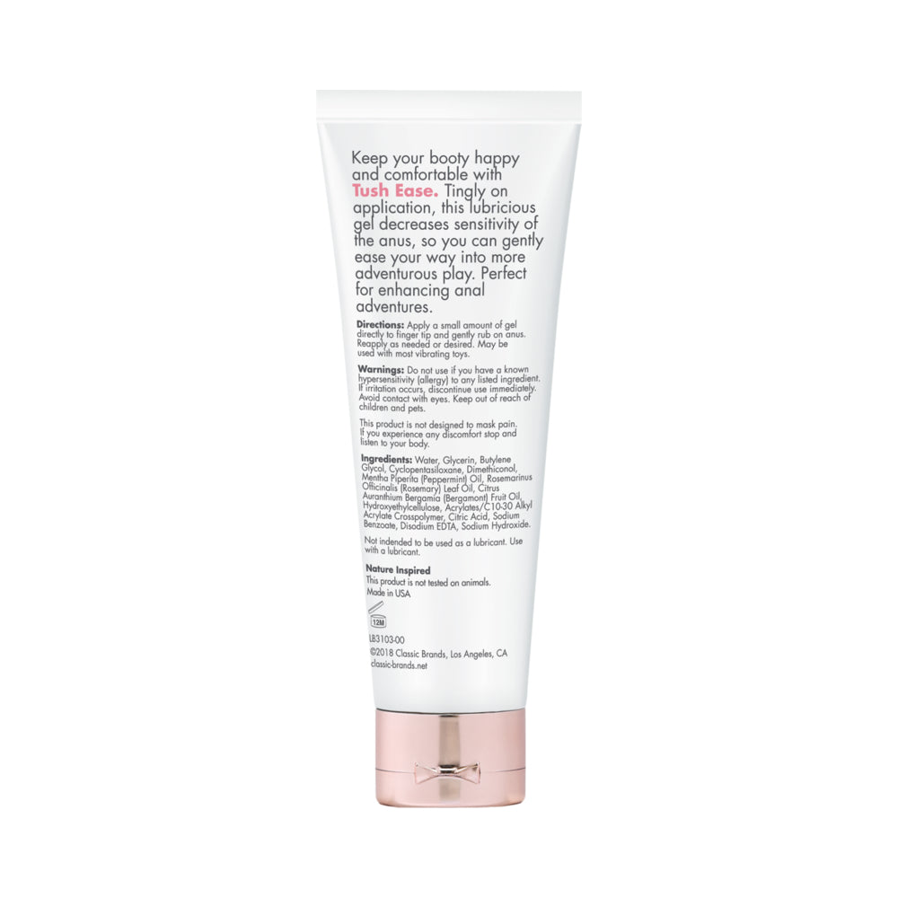 Keep your booty happy and comfortable with Tush Ease. Tingly on application, this lubricious gel decreases sensitivity of the anus, so you can gently ease your way into more adventurous play. Perfect for enhancing anal adventures Apply a small amount of gel directly to finger tip and gently rub on anus 10-15 minutes prior to penetration. Reapply as needed or desired. May be used with most vibrating toys. This product is not designed to mask pain. If you experience any discomfort stop and listen to your body. Tingly serum, ideal for naturally decreasing anal sensitivity. Formulated with natural ingredients. Fragrance Free. Made in the USA. This product does not contain benzocaine.