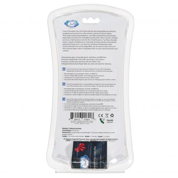 Cloud 9 Novelties Duo and Trio Borosilicate Glass Kegel Balls are perfectly weighted and encased in a silky smooth, premium silicone sleeve. These high quality hypoallergenic, smooth polished borosilicate glass kegel balls will help strengthen the pelvic floor muscle. Ideal for temperature play. Cloud 9 Novelties Health and Wellness Premium Borosilicate Glass Kegel Balls. Recommended for Bladder Control and Pelvic Floor Exercises. Borosilicate glass is hypoallergenic, lead free, and BPA free. Premium Kegel balls work with your body's own motion. Features a body safe, premium silicone tether cord. Weighted Borosilicate Kegel balls are easily removed for cleaning.