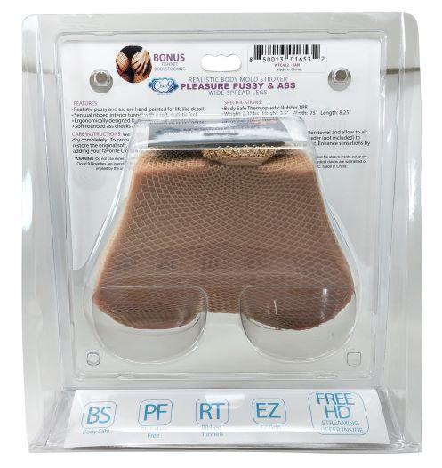 Cloud 9 Novelties Realistic Pussy and Ass Body Mold with Spread Legs Tan features hand painted for life like details. This Pleasure Pussy and Ass is a solid 2.37 pounds of soft, realistic feel ass. Featuring openings for the users pleasure, the upturned pink pussy has been hand painted for life like detail. Both openings feature interior ribbed tunnels for a more sensual experience. Users can also add a vibrating bullet, not included, in the anal opening for a more intense experience. Made of body safe Thermoplastic Rubber TPR. Includes a bonus fishnet bodystocking that can be removed for play. Do not use with mineral oil based personal lubricant. Made using body safe BS materials. Phthalate free PF. Ribbed tunnels RT. Easy grip EZ. Specifications: Body Safe Thermoplastic Rubber TPR. Weight 2.37 pounds. Height 3.5 inches. Width .75 inch. Length 8.25 inches. Care instructions: wash after each use with liquid antibacterial soap and water. Pat dry with a soft cotton towel and allow to air dry completely. To properly maintain your Cloud 9 Novelties Stroker product, generously apply renew powder. Sold separately to restore the original soft, non-sticky texture. Store your stroker in a cool dry place, protected from dust or lint. Enhance sensations by adding your favorite Cloud 9 Novelties Lube. Warning: do not use mineral oil or oil based products. The lubricant may cause deterioration of the Cloud 9 Novelties Pleasure Pocket Stroker. Do not flip sleeve inside out to dry. Cloud 9 Novelties are intended for use strictly as adult toy novelties. They are not intended for medical use and have not been clinically tested. No medical claims are warranted or implied by the use of these products. 30 day limited warranty. Cloud 9 Novelties, Pennsauken NJ 08110. Manufactured for WTC MFG, LLC. Made in China. MAPs price 54.95.