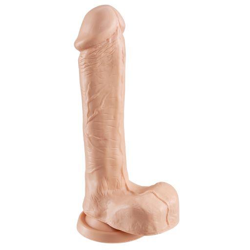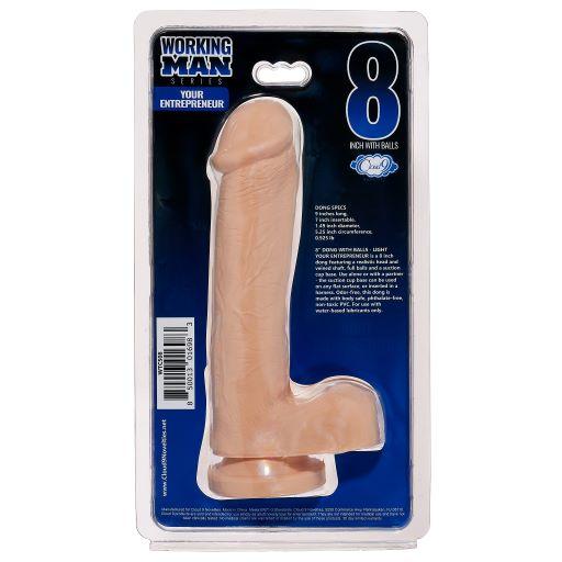 Cloud 9 Working Man 8 inches Light Skin Tone Beige Dildo with Balls Your Entrepreneur. Dong specifications: 9 inches long, 7 inches insertable, 1.49 inches diameter, 5.25 inches circumference, 0.925 pound. 8 inches Dong with Balls Light Skin Tone Beige. Your Entrepreneur is a 8 inches dong featuring a realistic head and veined shaft, full balls and a suction cup base. Use alone or with a partner, the suction cup base can be used on any flat surface, or inserted in a harness. Odor free, this dong is made with body safe, phthalate free, non-toxic PVC. For use with water based lubricants only. Do not use Silicone Based Personal Lubricants. Manufactured for Cloud 9 Novelties. Made in China Meets EN71-3 Standards. Cloud 9 Novelties, 9250 Commerce Hwy, Pennsauken, NJ 08110. Cloud 9 products are sold and intended for use strictly as adult novelty toys for entertainment. They are not intended for medical use and have not been clinically tested. No medical claims are warranted or implied by the use of these products. Size 9 inches, 7 inches insertion length, 1.49 inches in diameter and 5.25 inches circumference. Categories: Dildos, Dongs, Realistic Dildo Large, Dildos and Dongs Realistic. 2022.
