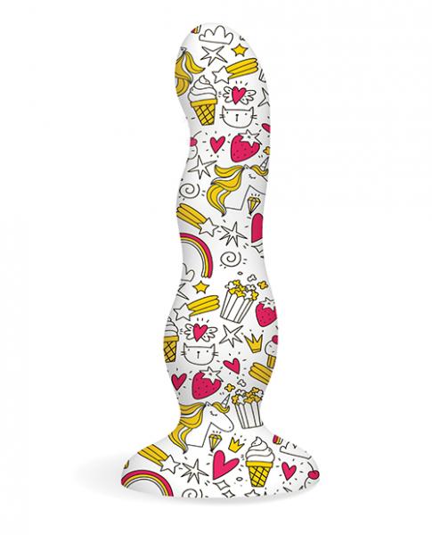 Collage Cupcakes and Unicorns Dildo from Icon Brands. Premium silicone adult toys, with beautiful, body safe coloring. Each piece is hand crafted for your unique pleasure. Eye popping designs tattooed right onto the silicone. Soft and silky and just the right size, they are colorful, whimsical, elegant and stunning. Each features and ultra grip suction cup which also makes them harness compatible. They quickly warm to your touch, are non-porous and easy to clean. Water based lubricant. Care: gentle soap and water to clean only, never an alcohol based soap. Size 7 inches in total length by 3.7 inches in width.