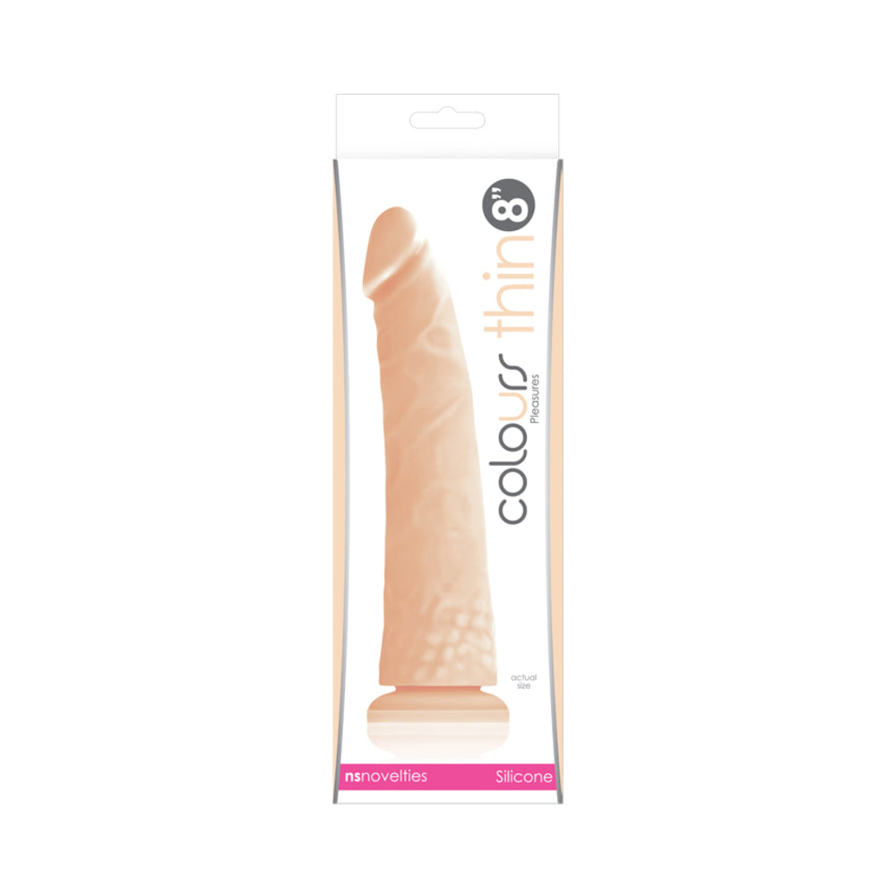 The popular Colours Pleasures dong is available in a super slim edition. It's made of satin textured superior grade silicone for a satisfying sensation. Features a strong suction cup. Measures 8 in. by 1.5 in.