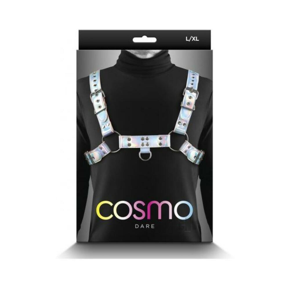 Dress up your assets with Cosmo`s stylish chest harness.andnbsp;Accented with silver nickel-free hardware and adjustable straps for the perfect fit. Made from easy to clean vinyl. Cosmo harnesses are available in a variety of styles and sizes.