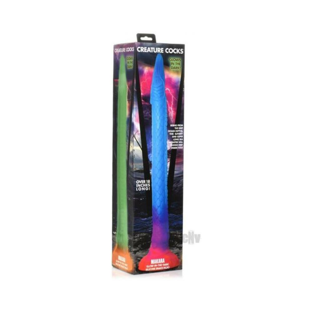 This may be the most beautiful anal hose you've ever seen! This 18 inch long dildo is perfect for snaking your drain, and this time it looks like a mystical sea snake! With a base that is sunburst colors of yellow and orange and a body that is shades of purple and blue, it also has fine, detailed designs along the body and glitter embedded in it, too! From the flower petal base to the scaled and sucker-covered body to the sea snake head that has gills, eyes and a mouth, this is a gorgeous toy you'll be proud to show off or privately enjoy! Made out of premium, phthalate-free silicone, it has a firm core and is flexible and smooth. When exposed to UV light or sunshine, it also glows in the dark! Use the wide, suction-cup base to keep it in place and use it hands-free, or combine it with a compatible strapon harness for kinky cosplay, fantasy roleplay, or hot pegging play! After play is over, wash the dildo with warm water and soap and use a toy cleaner to spray clean. Wipe dry and store in a cool, dark place out of direct sunlight.As you swim along the forbidden shores, you see something underwater that catches your eye. It's more colorful than a tropical reef and glows with a light that shimmers in the ocean. As you get closer, it speeds up and comes eye to eye with you. You can see the fine details of its mouth, head and body… a strange and beautiful snake of the sea, a tiny dragon that can swim faster than you dare to try. During an endless pause, you start to think about its sinuous body and how sexy it could move against your flesh. Then, before you know it, it has slipped around your leg and spirals up your thigh, under your bathing suit, and penetrates you! You gasp and begin to swim for air. By the time you get above water, your body is writhing, and you have no choice but to give in to what seemed shocking but now is overwhelmingly pleasurable!Measurements: Overall length: 18.25 inches. Insertable length: 16.5 inches. Narrowest insertable diameter: 1.5 inches. Widest insertable diameter: 2 inches.Materials: SiliconeColor: Orange, Purple, Blue, GlitterNote: Use only with water-based lubricants. Key Features: Fantasy Anal Hose: This mystical sea snake has an artfully designed base that is sunburst colored with yellow and glowing orange and a body with shades of purple and blue. The tip of this hose has the detailed head of a snake with eyes, gills and mouth. Along the hose are scales and sea-creature suckers. It's bendy and flexible to snake down your hole! Suction Cup Base: Enjoy the wide, suction cup base of this dildo. Simply press firmly on any flat surface and enjoy riding it hands-free! Harness Compatible: The wide, flanged base is compatible with most strap-on harnesses so you can wear it and play the fantasy roleplay character you come up with! Glow-In-The-Dark Silicone: Made of body-safe, phthalate-free, premium silicone, it will also glow in the dark after being exposed to UV light or sunshine.