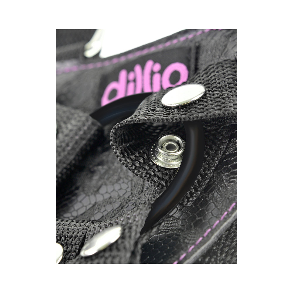 Two heavy duty adjustable nylon shoulder straps connected to a comfortable strap-on harness, this suspender system keeps a strap-on Dillio stays in place. The soft nylon shoulder straps, waist straps and thigh straps easily adjust to fit most sizes, while the smooth harness feels great against your skin. The included 6-in. Twister Dillio dildo can be removed from the silicone O-ring after the fun. The harness also works well with most suction cup dildos. Toy cleaner and lotion included.