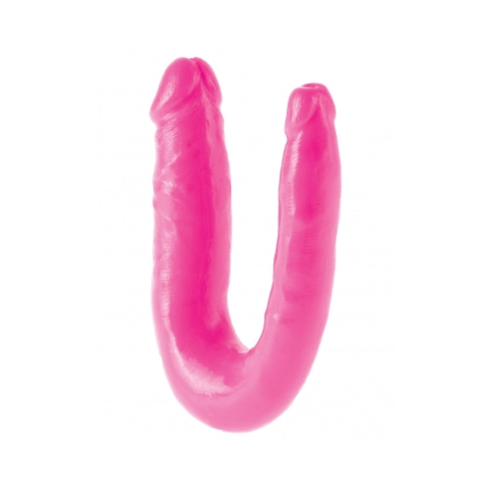 This pink PVC double dildo features veins and sculpted heads, one large and one small. Phthalate- and latex-free and hypoallergenic.