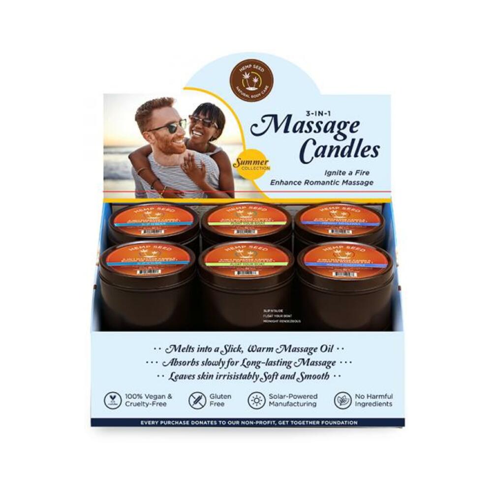 This retail display contains 12 of our popular massage candles in special scents just for summer! Each display contains 4 pieces of the fragrances Midnight Rendezvous, Float Your Boat, and Slip 'n' Slide. A free Midnight Rendezvous tester is also included.