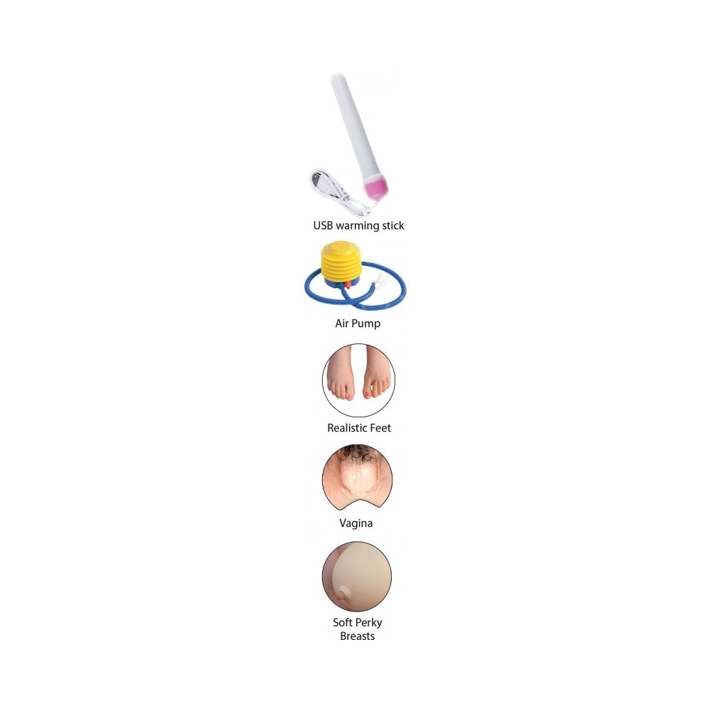 This inflatable sex doll is a life size brunette, ready for sitting on top of you or enjoying doggy style. Triple hole love doll is realistic, with molded face and expressive eyes and long eyelashes. Features enhanced lips, realistic pussy lips, tight pear shaped ass with a super soft realistic anus, soft perky breasts and erect pink nipples. Waterproof. Includes USB warming stick, air pump and repair kit, vibrating egg and sensual sound effects.