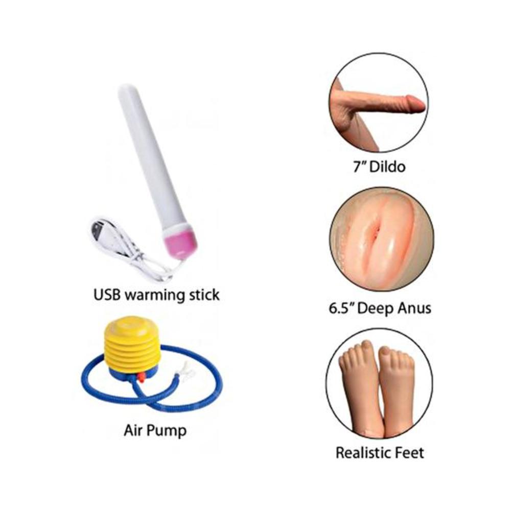 Doll’s sexy face with realistic eyes, along with a soft willing mouth, is made from a firm, flexible jelly rubber. Realistic feet and hands wrap around you. His hard cock is the perfect size and is made from ultra-realistic material. Vibrating dildo function. Includes USB warming stick, air pump and repair kit. Dildo measures 7 in. long and 5.25 in. girth. Penetrable anus is 6.5 in. deep.