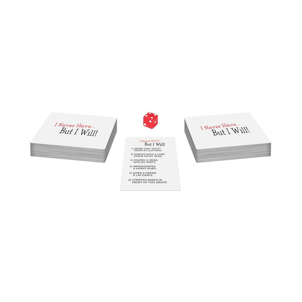The crass party game with over 600 dares! After an I Never Have statement is made, players indicate who of them have never done the action. The first of these players who announces, But I Will then acts out the dare and earns the card as a point. Play for points or as a drinking game. Includes: a die and 100 dare cards.