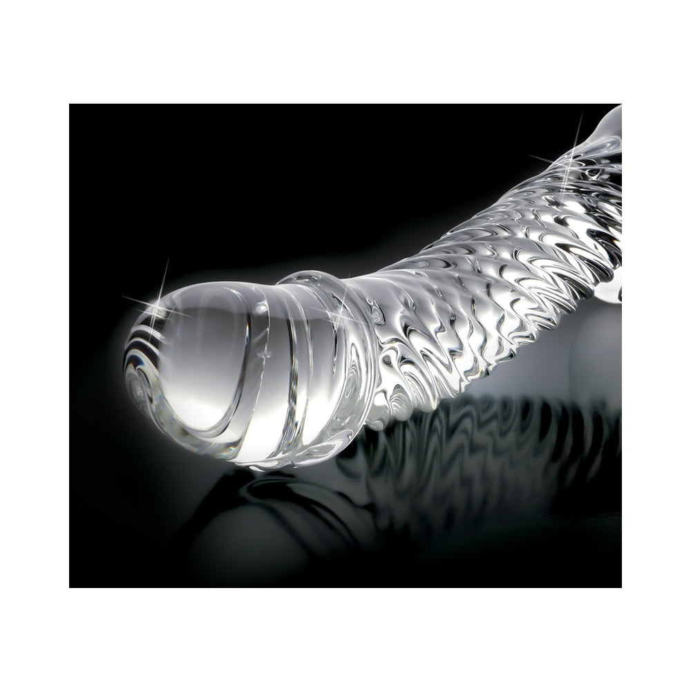 Elegant, upscale, and hand crafted with amazing attention to detail, this luxurious line of glass massagers will leave you breathless. Each hand blown Icicle glass wand is sleek, unique, and made to play hard.Perfect for beginners, this elegant glass massager features a tapered tip to ease insertion and a pronounced head that hits all the right spots, while the balls at the base offer an ultra-realistic experience. Cleverly curved for explosive G-Spot or P-Spot stimulation, you'll enjoy additional stimulation thanks to the swirly ribbed shaft.The hypoallergenic glass is nonporous and body safe, and when cared for properly, is designed to last a lifetime. Run the wand under warm water or place it in the microwave to heat things up. Chill it under cold water or put it in the freezer for a cool sensation.Insertable length is 5 inches, width 1.25 inches.