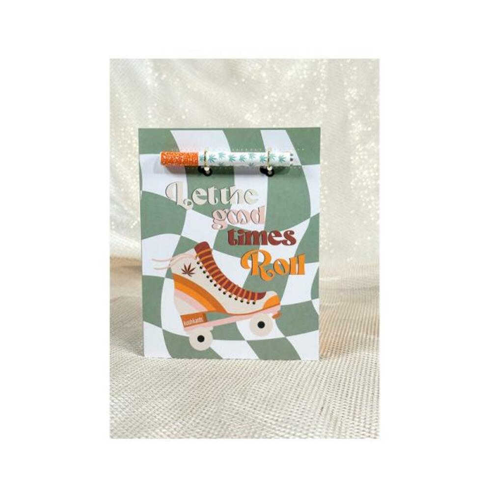 A card for rollin' in the good times. There are so many ways to roll and here is the perfect card to do just so! This brand-new retro cannabis greeting card can be used for any occasion, so pick it up and write a message on the inside and give this card just because! Get this KushKard with the matching one hitter and add your own flowers. However you roll, I hope it's good.Blank on Inside.The Original Cannabis Greeting Card AKA the Gift with a Lift. KushKards are colorful, clever, fun, and unique greeting cards for the cannabis enthusiast and their friends. Made on high-quality paper in the USA.DISCLAIMER: IT IS ILLEGAL TO MAIL ANY PRODUCTS CONTAINING MARIJUANA