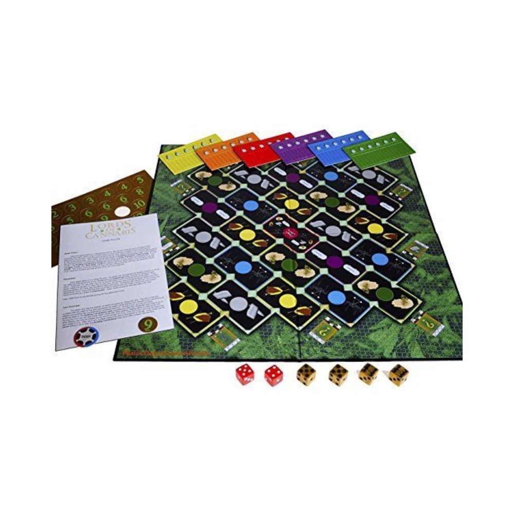 The Strategic Game of Reaping, Corruption, and Conquest! Reap the rewards of expanding throughout the vast pot fields of cannabis. A strategy might work once, but in the next game, everything will change. Build, trade, and steal your way to becoming the True Lord of Cannabis. Game includes: one 17 x 17 in. game board, 100 Stash Cards, 38 Crop Cards, 2 dice, 1 sheriff badge, 6 Reference and 2 Reward Cards, 24 numbered chips, 6 Building Tiles and 15 Tunnels per color.