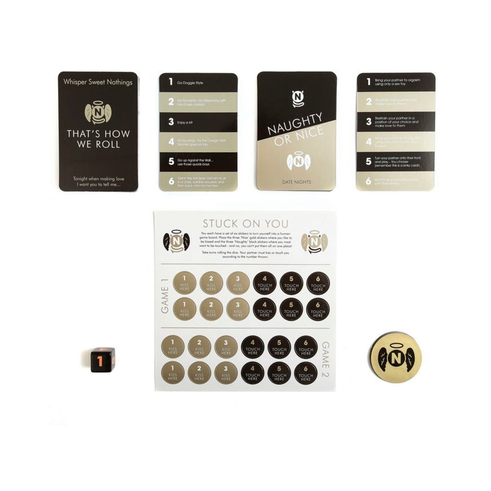 This romantic game of chance includes game dice, blindfold, and feather. Roll the dice and let love take over.