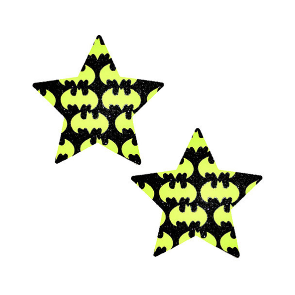 Neon glitter blacklight bat signal pasties use latex-free medical-grade adhesive. Made of swimsuit material, they last for 10 to 12 hours.