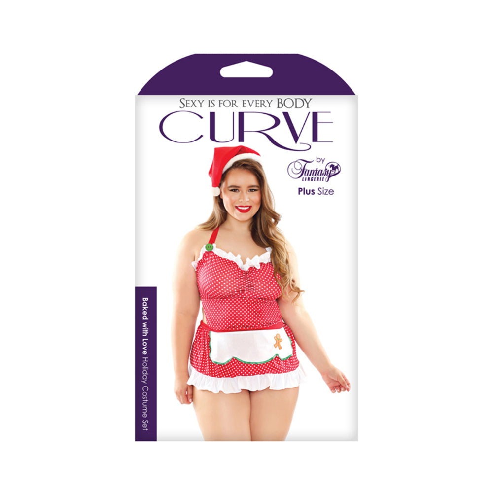 Spread some cheer in this 3 piece set. Baked with Love comes with a ruffle-accented microfiber apron dress, matching ruffled panty and holiday hat. Because nothin' says lovin' like something from the oven. Features: • 3 Piece Set • Hat Included • Ties at Neck & Back • Hook & Eye Closure Color: Red/White Fabric Content: 95% Polyester 5% Spandex Washing Instructions: Hand wash separately in cold water. Do not bleach. Flat dry.