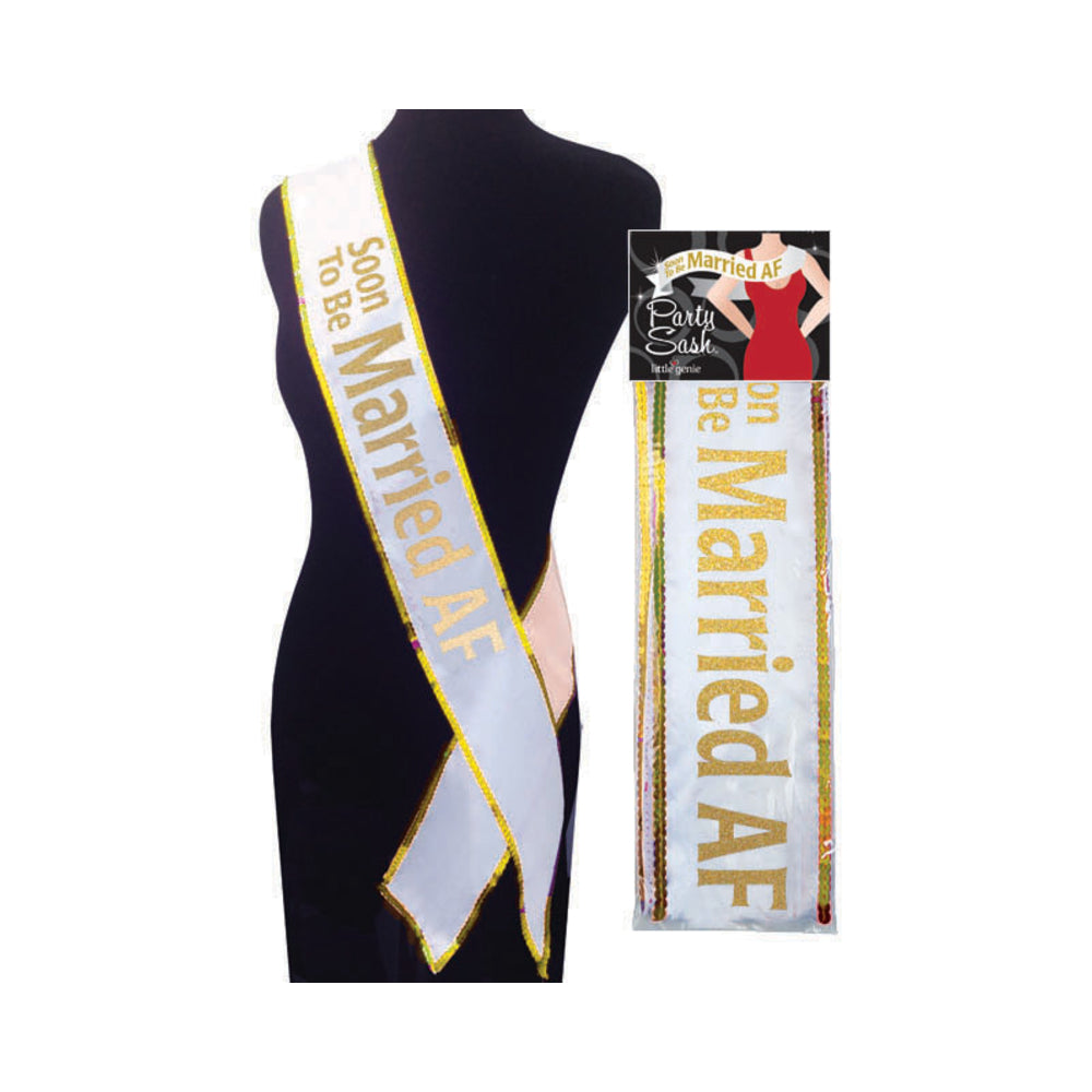 Soon to Be Married AF Party SashA sparkling addition to your Bride to Be's wardrobe. You'll definitely be the center of attention with this 6ft. long party sash. Adjustable to fit most brides. For additional fun, pin on candy or condoms. Safety Pin Included.
