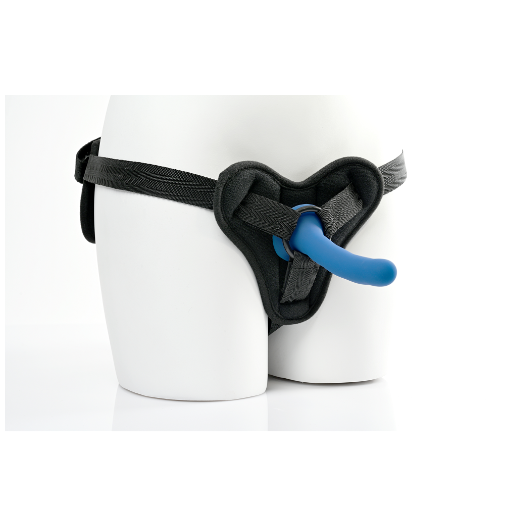 The velvet-texture harness’s adjustable nylon straps ensure a perfect fit up to 72” (183 cm) hips, while padded front and back panels protect your sensitive areas during vigorous play. This set includes a slim, 5.25" silicone dildo perfect for exploring, and secures via an interchangeable 1.25" rubber O-Ring. A built-in pocket in the front panel makes space for your favorite bullet vibe (not included). Add our assorted O-Rings to fit any toy with a flared base. So don’t be afraid to browse our selection of body-safe dildos. The harness is machine washable making cleanup a breeze! Perfect for any New Comer to strap-on play! Padded for comfort and includes a slim, silicone dildo that's ideal for new exploring couples. Size: waist 72" (183 cm) 5.25" silicone dildo Includes: 4-Way adjustable harness fits up to 72" hips (183 cm), Interchangeable rubber O-Ring 1.25" (3.2 cm), 5.25" silicone dildo Harness Materials: 40% polypropylene, 30% polyester, 15% polyurethane foam, 5% hook and loop, 3% ABS plastic, 2% nitrile O-ring Dildo Materials: 100% silicone