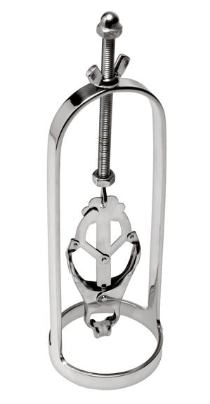 This nipple protraction device is designed to clamp down on and then gradually stretch out the nipple. Comprised of a stainless steel frame supporting a dangling clover clamp, it is designed to grip tighter the further the nipple is stretched. Just affix the clamp just behind the nipple, and twist on the wing nut. As the clamp is pulled upwards, the grip is increased, stretching the nipple out. This unique piece can be used by both men and women, and is sure to guarantee the most intense nipple sensation. Please note shown on love doll, not included.Measurements Frame measures 2.10 inches in diameter, 6.5 inches in length. Nipple extractor extends to a top length of 2.5 inches. Material Stainless steel. Color Silver. Note includes 2 nipple clamp devices.