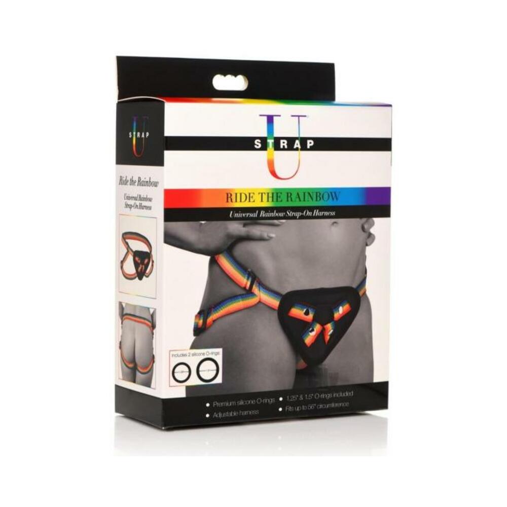 Add this colorful harness to your Pride collection or keep the rainbow theme going if you already have many rainbow or color-packed toys! This harness is for universal wear and is fully adjustable. Use the nylon straps and plastic buckles to tighten or loosen for a comfortable and secure fit that can change as much as you and your strapon dildos do! Each new dildo may offer more or less weight so you can adjust as is needed, and if you choose to share the harness with a partner, they can adjust for their sizing, too! The front of the harness has a triangular pad that has PU faux leather in front and soft velvet in back which not only pads your pelvis but provides soft, gently rubbing instead of chafing against your tender skin. The harness includes two different size silicone O-rings that will fit most strapon dildos. The straps attach to the strapon triangle in front and then wrap around each thigh so you can keep your derriere fully accessible for your partner to enjoy in between pegging and pounding! Choose your desired strapon and make sure one of the silicone O-rings fit over the shaft. The O-ring should not slip behind the base of the dildo. Use the nickel-free, iron snaps to affix the compatible O-ring in place, then slide the dildo through the O-ring. Once the dildo and O-ring is securely in place, slide one leg and then the other through the harness. Use the buckles to tighten until the harness stays securely on and doesn`t slip over your hips. Walk around and practice thrusting to see if the harness slips off or needs to readjust, and adjust again as needed. Then, grab your partner and some lube and sex toys! The rest of the scene is for you two to play with! Let them guide the strapon dildo inside so they`re doing most of the work. Once they`re comfortable with the size and feel of that dildo, you can start thrusting away and pounding them until they have had enough or want to switch with you! To clean, spot clean with mild soap and warm water and rinse. Measurements: Waist adjusts up to 56 inches circumference. Thigh straps adjust up to 36 inches in circumference. O-ring diameters: 1.25 inches, 1.5 inches. Materials: PU leather, nylon, silicone, iron, velvet, plastic Color: Rainbow Note: Strapon dildo sold separately. Key Features: Rainbow Harness: This brightly colored, nylon harness is a perfect addition to your Pride collection or other rainbow items! Adjustable Straps: Use the plastic buckles to tighten or loosen the tension around the hips and thighs. Get a comfortable and secure fit each time! Open Back Design: Peg your partner and still show off your booty! The straps go from the front of the waist to around each thigh so your bottom, rear entry and that lovely space between your thighs stays fully accessible! Faux Leather Strapon Pad with Rings: The triangular pad that the dildo base presses against is made of PU faux leather and has a velvet back so it is soft against your skin. The harness comes with 2 different size O-rings that will fit most strapon dildos.