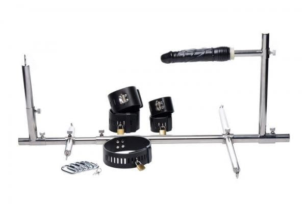 Punish and please your plaything in this deviously distinctive twist on a stockade! Restrain your lover by their neck, both wrists, and their ankles as they are penetrated by a veiny black cock! All parts of this remarkable contraption are adjustable, so you can extend the base bar, customize the height of the dildo and collar, and alter the locations of your lovers wrists and ankles. Construction could no be easier, with simple screw tight connecting tubes. The luxurious, heavy duty cuffs are all finished with a locking bracket to ensure that they cannot escape, and a D-ring for connecting them to the stockade or even use in other bondage scenes! Enrich your BDSM fantasies as they come to life with a unique instrument for locked down penetration. Measurements base bar adjusts from 26 to 47 inches. Wrist bar is 10.5 inches across. Ankle bar is 20.5 inches across. Height of dildo adjusts from 1.5 inches from base to 11.5 inches from base. Dildos protrudes 11 inches from bar. Insertable portion measures 7.5 inches in length, 1.75 inches in diameter. Collar adjusts from 13 to 18.5 inches in circumference. Wrist restraints adjust from 6 to 8.5 inches in circumference. Ankle restraints adjust from 6 to 11.5 inches in circumference. Materials Stainless steel, aluminum alloy, PU leather. Color Smoke. Note includes 7 bars to fit together, collar, wrist restraints, ankle restraints, dildo, 5 lock and key sets, and 5 connectors. Warning: this is a NEW item that is not in retail packaging, usually a plain box, wrapped in plastic or a poly bag.