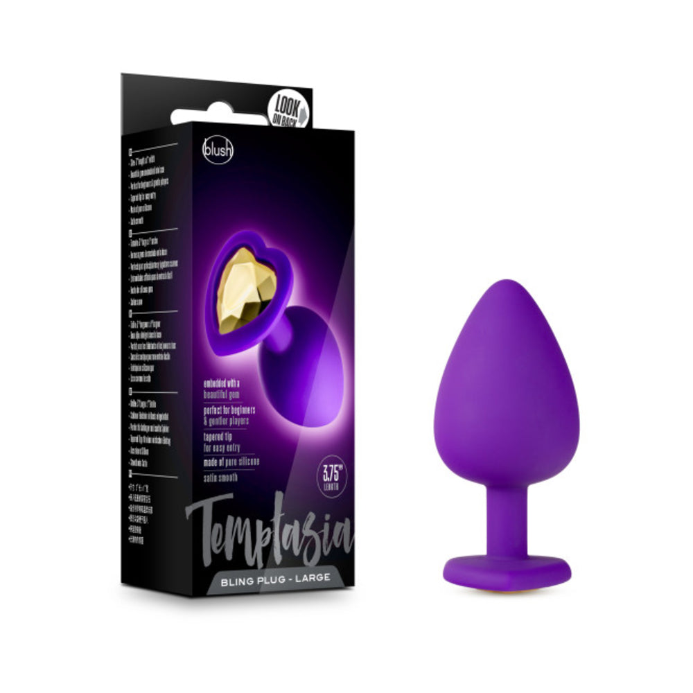 Your play just got pretty with this sweet Bling Plug! The Temptasia Bling Plug Large features a beautifully designed heart-shaped base, embedded with a golden gemstone. This satiny silicone plug has a tapered tip for easy insertion. The tight neck offers gentle pressure and is ideal for extended wear. Or show your bling during your regular erotic play! For the best experience, use with your favorite quality water-based lubricant. Made of platinum cured silicone, Temptasia Bling Plugs are body safe and easy to clean. •BODY JEWELRY - Designed with a Heart-Shaped Base & a Beautiful Gold Faux Gemstone •COMFORT - Tapered for Easy Insertion; Satin Smooth Finish •FLARED - So the Plug Stays Securely Inserted •PEACE OF MIND - Made of Platinum Cured Silicone. Contains No Fragrances, Phthalates, Paraffins, or Latex •SIZE - 3.75 Inch Length (3.2 Inch Insertable) x 1.75 Inch Width