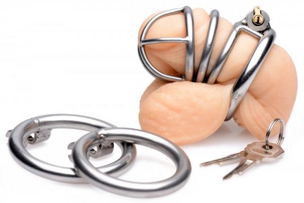 Whether you are putting that penis in timeout or life in prison, this elegant stainless steel chastity cage will assert your control and your partners helplessness. Three different sizes of O-rings are included to find a comfortable or uncomfortable fit, depending on what your slave deserves. The most unique feature of this device, however, is the internal locking system. Insert the key into the brass keyhole and turn to straighten out the lock. The lock can then be inserted into the hinge. With another twist of the key, your slave is left impotent and trapped until you decide to set them free, if that day ever comes! Measurements: O-rings are 1.5 inches, 1.75 inches, and 2 inches in diameter. Cage is 2.25 inches in length, 1.3 inches in diameter. Material Stainless steel. Color Silver. Note includes locking mechanism and two keys.
