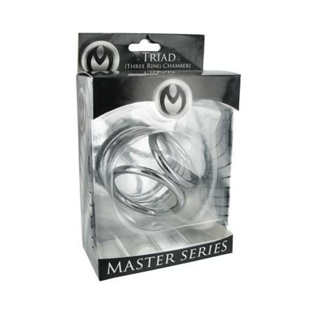 The Triad Chamber brings the art of domination in threes. This chrome cock cage features three differently sized O-rings with which you can ensnare your pet. The largest ring goes around the cock and balls like a normal cock ring. The middle sized ring goes around the balls, providing the wearer with a pressure sensation. The third ring goes around the base of the penis to help you maintain the kind of erection that lasts for extended sessions. The Triad Chamber is perfect for the experienced user who wants a sleek and modern look, but seeks a weighted, more supportive cock ring. Medium Ring 1.84 inches internal diameter. Bands are 0.29 inch thick, Material Chrome Plated Steel.