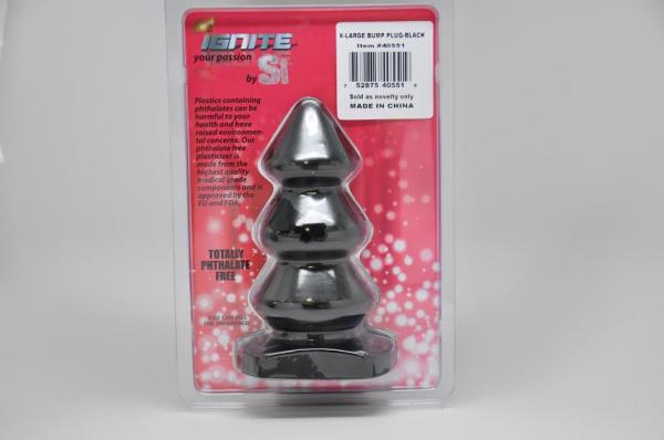 Bump Plug Black Extra Large is made using phthalate free materials PVC. Bump Plug features: a tapered end for easy insertion. Three graduated levels of pleasure plus a flat t-base for easy use. Plug measures 5.75 inches length by 2.6 inches wide at the thickest diameter.