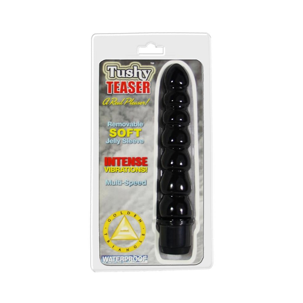 Tushy Teaser (Black)This 5 1/2" waterproof vibe comes with attached and removable silicone sleeve. The unique shape of the sleeve makes it great for anal play, however the powerful vibration that this vibe gives will make it great for anything you want to play with. Easy to use multi-speed controls.Requires 2 AA batteries, not included.