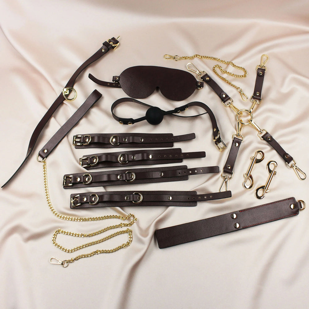 Bring your fantasies to life. Start slowly by introducing some sensory deprivation play with the blindfold and gag ball. Now you (or your partner) can’t talk or see, all there is left to do is feel. Take it up a notch by adding hand and ankle cuffs to increase the dom/sub feeling. The chain and hooks offer multiple restraint options for you to choose from: hands together, ankles together, hands and ankles, or even tying your hands or ankles to bed or door restraints (not included). Ready for the real deal? Whip out the spanking paddle and the collar with leash. Whether your lover (or you) has been naughty or nice, they are about to find out. Once done with your magic session, store back into its discreet PU leather case till next time.Includes:Collar and leashBall gagBlindfoldHandcuffsAnkle cuffsSpanking paddleFour-piece restraint hooksStorage bagMaterial: PU Leather and Stainless Steel