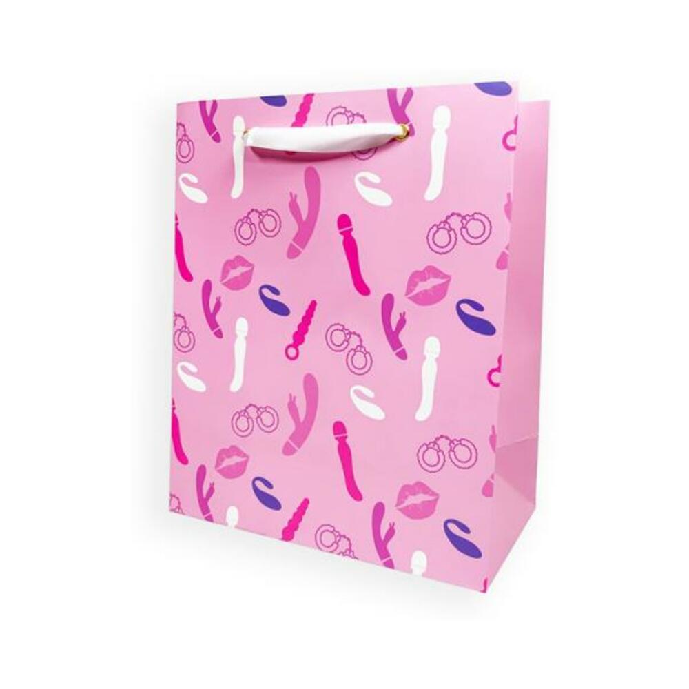 Vibrator print naughty gift bag with a white ribbon handle and gold grommets.